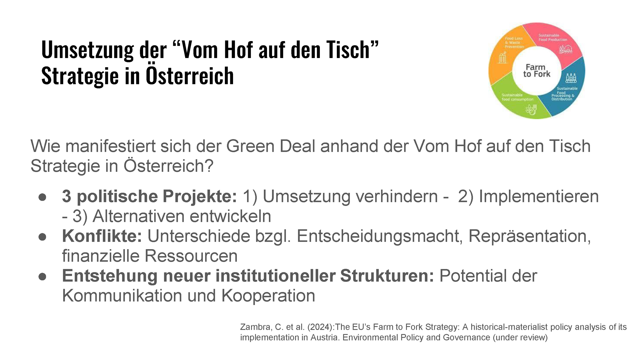 Ein zweites Beispiel aus Österreich: Vom Green Deal haben wir schon gehört, die Farm to Fork Stragegy ist Teil davon. Wir haben die Frage gestellt, wie sich der Grean Deal anhand der Vom Hof auf den Tisch – Strategie in Österreich manifestiert. In Experteninterviews haben wir 3 politische Projekte identifiziert, getragen von 3 verschiedenen Gruppen